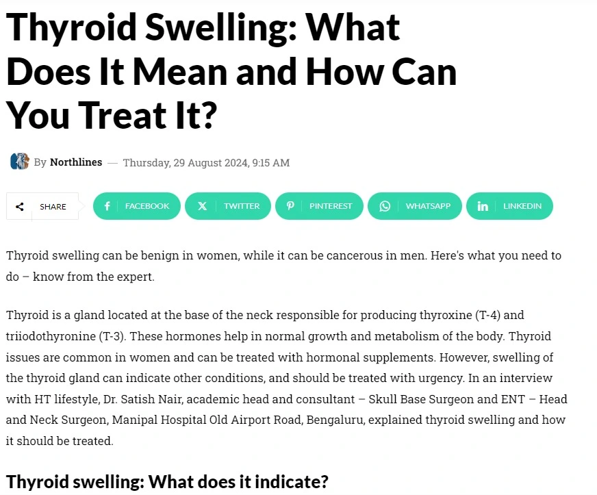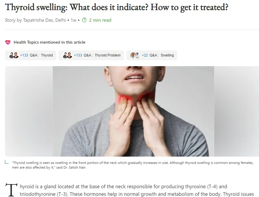 “Thyroid swelling is seen as swelling in the front portion of the neck which gradually increases in size. Although thyroid swelling is common among females, men are also affected by it,” said Dr. Satish Nair.